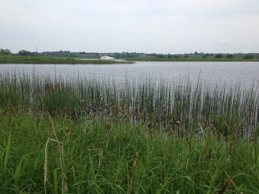 The road from Shannonbridge followed hedges overflowing with cow parsley and bright yellow gorse. When I reached the riverside callows, I came across a fellow cyclist and dog-walker, who introduced himself by the name of Flan – a serendipitous encounter, which the author himself would have enjoyed, even though he spelt his name only with one ‘n’. We talked about the title of the O’Brien book with which Flan was familiar and walked across the callows to get as close as we could to the edge of both islands. The meadows were filled with a sea of buttercups, pignut, plantain, gleaming cowslip, the bobbing heads of bog cotton and cuckoo flower all starring the grass. The river here is low-lying here but it was clear that the two islands appeared to be made up mostly of grass and stone. Curley’s Island, a thin six-acre strip of grass and sand, lies to the north of Devenish Island which is larger. There was an architectural grandeur to the lofty tottering reed beds rising with a towering palisade of stems up to six metres. When we reached the river we made out the division with one part falling down like a finger to Devenish. Cattle were relaxing on the island, in no hurry to move anywhere.