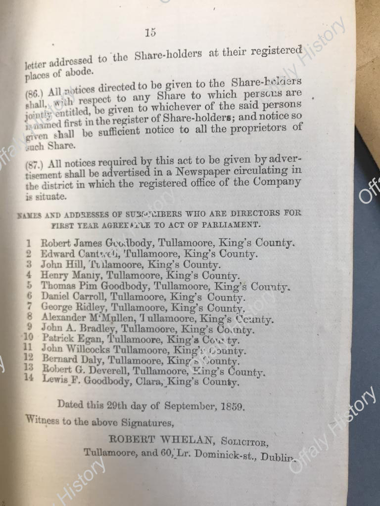 In treating of Tullamore from the historical point of view, no mention has been made of a body which is closely connected with the commercial and industrial life of the town, namely, the Tullamore Gas Company. For over half a century the Gas Company has been closely allied with the industrial concerns, and it will be found that the first board of directors was composed of gentlemen who had the welfare of the town at heart, and who strove in their day to make it a prosperous centre of commercial enterprise. In this connection, then, a reference to the Gas Company will not be out of place. The company was formed in 1859 as “The Tullamore Gas Co., Ltd.,” with a nominal capital of £2,500, divided into five hundred shares of £5 each. The first meeting of the subscribers was held on the 15th September, 1859, when the following were appointed directors for the first year:- Messrs. Robert James Goodbody, Edward Cantwell, John Hill, Henry Manley, Thomas Pim Goodbody, Daniel Carroll, George Ridley, Alexander McMullen, John A. Bradley, Patrick Egan, John Willcocks, Bernard Daly, Robert G. Deverell, Lewis F. Goodbody, Clara, all of whom held 20 shares each. Mr John Willcocks was appointed Chairman, and Mr Robert Whelan, solicitor, was the legal adviser of the company. Messrs. Ridley and Cantwell were entrusted with the selection of the site for the proposed gas works, and a suitable plot was purchased from Mr George Pretty for the sum of £100 [in Harbour Street].