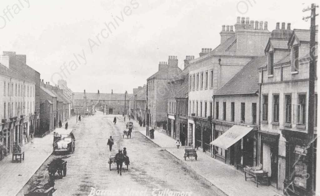 After the news of the shooting many people in Tullamore fled their homes. The Foresters’ Hall was burned on the same night as were the shops of well-known Sinn Féin sympathisers – Mrs Teresa Wyer (chair of the board of guardians), O’Brennan’s of Church Street and the hairdressing establishment of James Clarke in William/Columcille Street. Also damaged were the offices of the Offaly Independent, the Sinn Féin rooms overhead and the Transport Workers Hall. Houses visited by the Black and Tans included that of Whelan’s in O’Connell Street, Mrs Mooney, Crowe Street, Barry’s in O’Moore Street, Taylor’s in the same street, Kelly’s in High Street, Daly’s and Digan’s in Cormac Street. James O’Connor, the town councillor and president of the local branch of the Transport Union, was resident in Mrs Heavy’s in Harbour Street and having been seized by the police was lucky to escape. On Wednesday night it was the turn of Clara where Leo White (an officer who had served in the Great War and was a lieutenant in the Dublin Fusiliers) and brother of Michael White, was seriously injured by a R.I.C./Black and Tans raiding party. Other houses in Clara visited that night included Mrs Dignam, Mrs Berry of Church Street and Mrs Weir in River Street. On 3 November 1920 the premises and the business of the Athlone Printing Works including its Offaly Independent were destroyed. Curfew was imposed in Tullamore during darkness and searchlights were in operation. Black and Tans behaved in lawless fashion in many of the midland towns, even Birr much to the surprise of residents there.