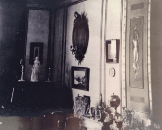 The drawing room led onto a conservatory through a floor to ceiling panelled glass partition with stone steps down onto a terraced lawn at the rear of the house. Positioned halfway down the drawing room, were two richly decorated, opposing plaster panels, depicting a white robed woman with hands raised above her head releasing a dove, in classical style, on a painted Wedgwood-blue background (Fig 16).