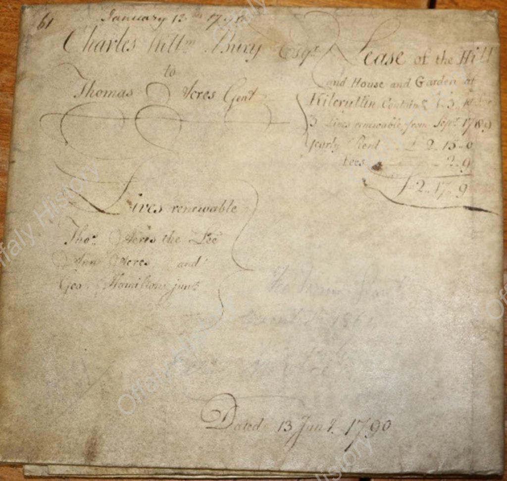 The hill of Kilcruttin was included in the lease from the town landlord, Charles William Bury to building speculator Thomas Acres in 1786. He was responsible for building most of the street by providing sites and building the terrace on the east side to accommodate army officers during the Napoleonic Wars, 1793–1815. The folly on the hill was built to commemorate the Wellington victories on the Iberian Peninsula. The tower is now in course of restoration and perhaps the stone with the carved names of Wellington’s victories will be found.