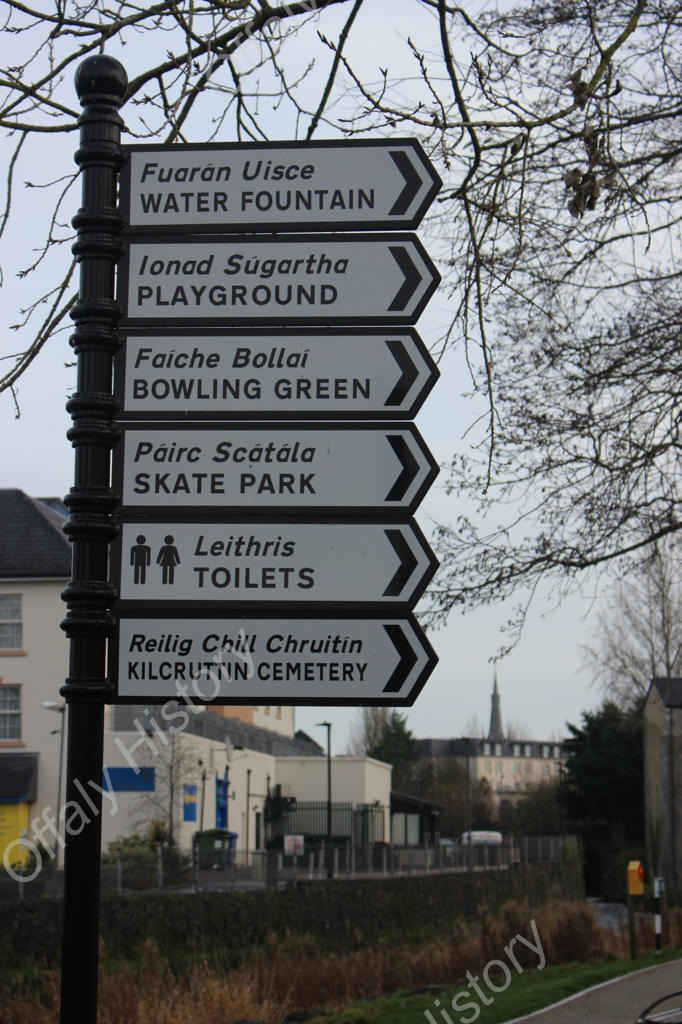 The park is in the townland of Kilcruttin and is bounded on the west by the Tullamore River and on the east by Cormac Street. The land was part of the Lloyd’s farm and Lloyd’s grocery was in nearby Cormac Street where the sports gear shop is now located.
