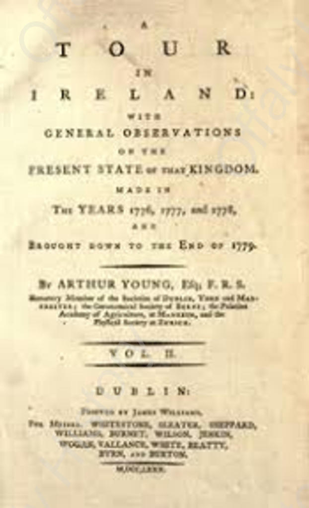 Advances in agriculture had come earlier, it seems, in Offaly. In the 1770s Lord Shelbourne’s estate at Rahan benefited from the appointment of a bailiff and agriculturalist, a Mr Vancover who was brought from Norfolk. Vancover was well schooled in the science of agricultural improvement and brought with him a ploughman and new ploughs, harrow and tackle to implement his ‘Norfolk husbandry’. He was described as being a ‘sensible, intelligent, active man who went through all the manual part of farming in seven years apprenticeship to a great farmer in Norfolk’. Amongst the land on the estate which Vancover had singled out for improvement was some 4,000 acres of bog. According to Arthur Young who visited the Shelbourne estate, the farm manager had commenced to grow turnips, a favourable decision he believed as this was always the most viable option for poor soil.
