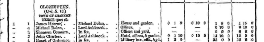 Image 4, Excerpt from Griffith’s Valuation, Town of Shannonbridge, Cloniffeen, Clonmacnoise, King’s County, 1854, p.135, online at http://www.askaboutireland.ie/griffith-valuation/.