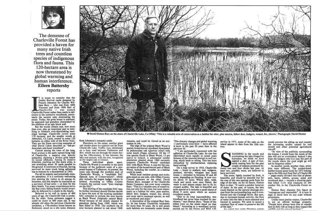 Revd Canon David Hutton Bury slipped away on 7 February 2021 after a long illness. His leaving became him in the sense that he had lived his life quietly on his farm at Charleville, Tullamore. In later years he found a second role as a priest, and later canon, in the Church of Ireland, serving the parish of Geashill and Killeigh until December 2017. David Hutton Bury was born in 1944 and was educated at Wellington and Trinity College Dublin. At Trinity he was able to research his life-long enthusiasm for natural history and completed a thesis on the native woodlands of Charleville, so famous now with the great ‘King Oak’ and other fine specimens throughout the wooded demesne providing a setting for the fairy tale big house, called from early days Charleville Forest.