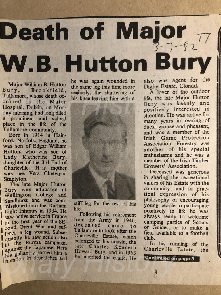 David was the only son of Major W.B. Hutton Bury (1914–82) and Mrs Bly M. Hutton Bury. The latter was a life member of Offaly History until her passing in her late nineties in 2018. At the time we recalled in a post that: