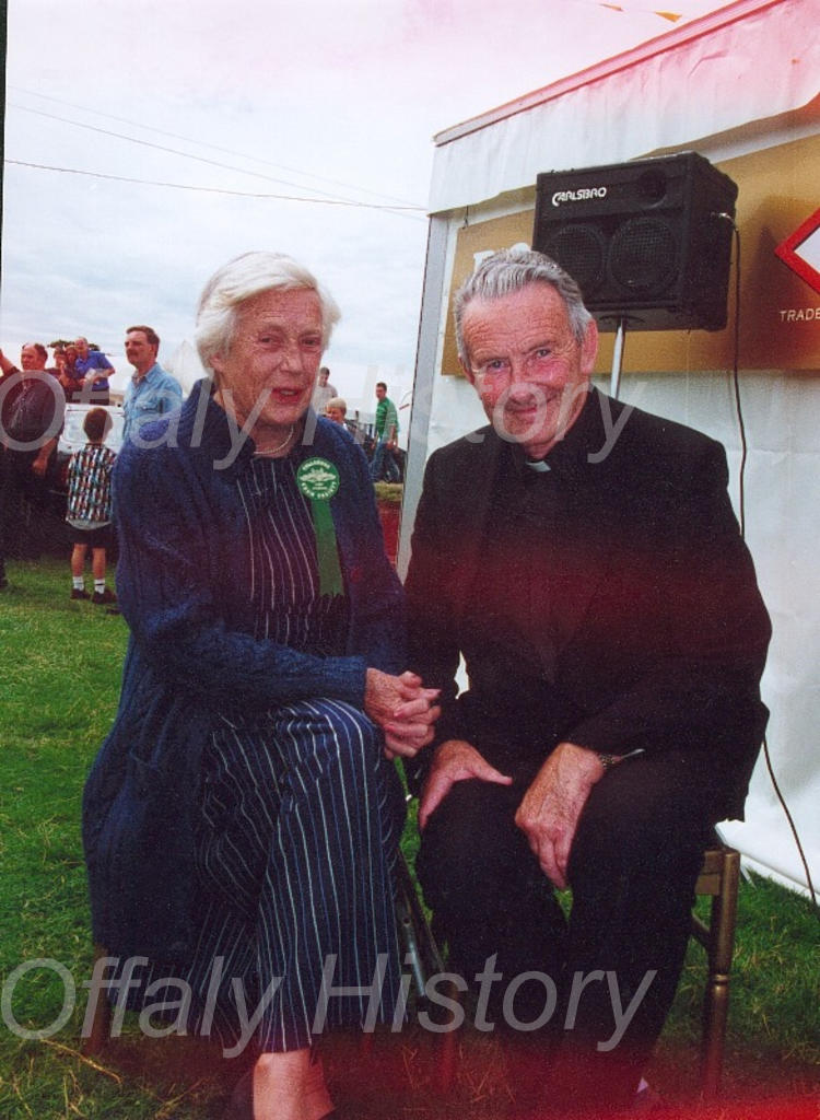 ‘We want to express our sympathy to the Hutton Bury family on the death of our life member Mrs Bly Hutton Bury who had reached a great age. She was a jolly person to be with on the historical tours we had and one recalls that when the destination was reached in Clare or wherever a cigarette and sometmes a gin and tonic were favoured, She is seen in this picture with the late Fr Willie Cleary and taken at a Tullamore Show at Charleville. Her late husband (d.1982) Major Hutton Bury was a supporter of many Tullamore projects and of great assistance to this Society, as is their son David and family.’