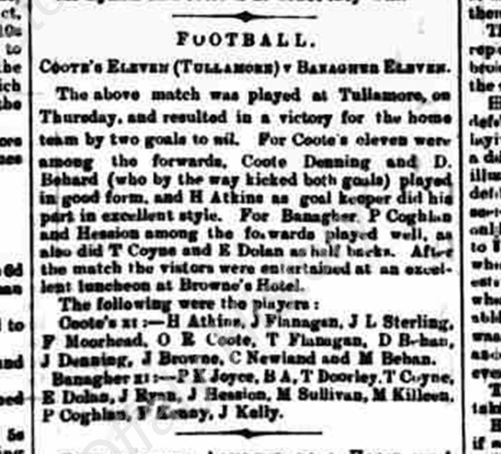 Another match recorded in Offaly during this initial period of activity was in Banagher in April 1881 between two teams from the Royal School when a ‘Banagher XI’ beat a ‘Lusmagh XI’ 2–1.