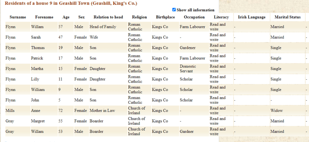 The 1911 digitised Census returns provide an excellent source of information and can be searched through religious classification. Looking at the returns for Geashill Town, reveals data such as the following: