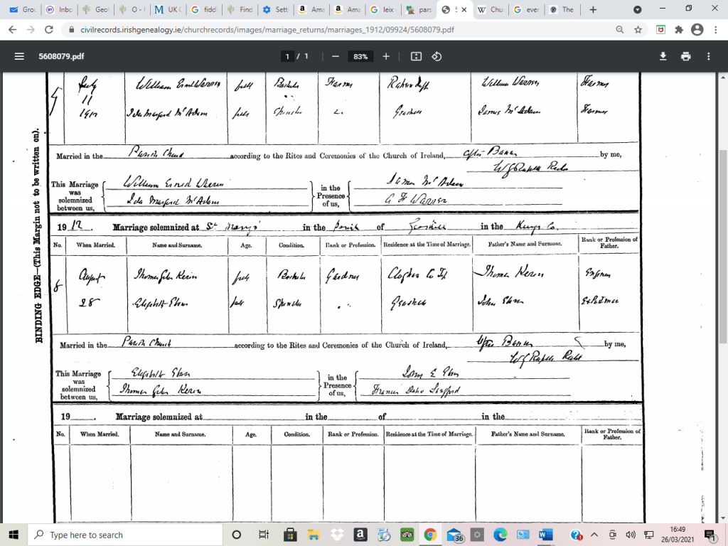 The Irish genealogical site www.irishgenealogy.ie holds a number of transcripts of births deaths and marriages. Below is the record of my grandparent’s marriage showing employment of my grandfather, a gardener, his father, an engineer (although this seemed an exaggerated name for a railway signalman, there is an Institution of Railway Signal Engineers) and my grandmother’s father, an ex-postman.
