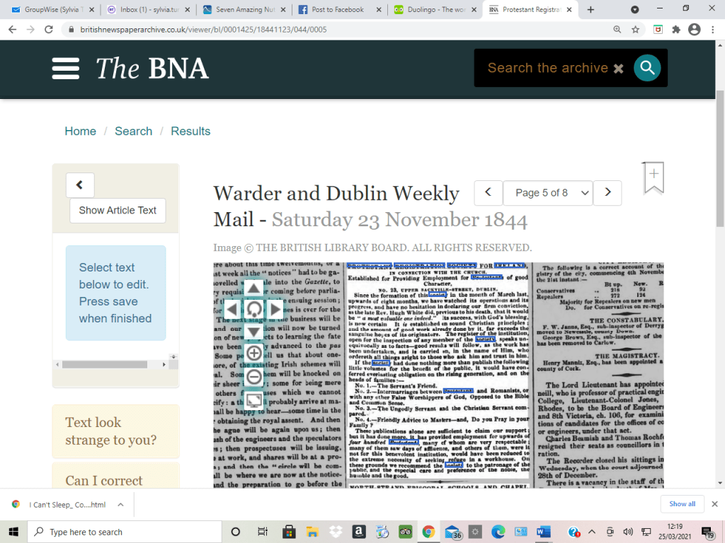 Although caution must be brought to bear on drawing conclusions from oral history alone, detailed exploration of records that are available can yield significant data to corroborate oral history accounts. The existence of working Protestant servants is evident in the announcement below in the Warder and Dublin Weekly Mail on Saturday 23 November 1844. It is interesting on many counts but particularly in noting many of those employed were in financial straits and could have ended up in the workhouse but had also seen ‘days of affluence’.