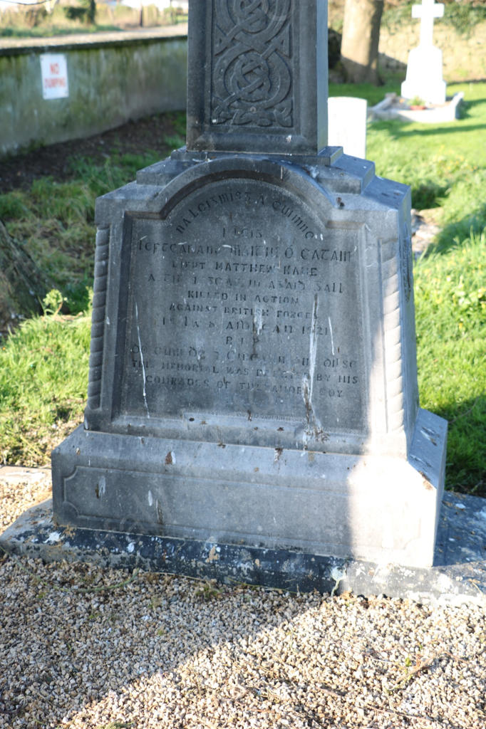 Outside the cemetery there was a Guard of Honour of Mucklagh F.C.A. and Very Rev. T.H. Burbage, P.P., V.F., Mountmellick, performed the unveiling ceremony, attended by another Guard of Honour from Tullamore. Volleys were fired over the grave, Mr. James Clarke, Chairman, Old I.R.A. Men’s Association, being in charge of the firing party. The last post was sounded and the proceedings in the cemetery concluded with the laying of wreaths on Lieut. Kane’s grave. Wreaths were also placed on the grave of Volunteer Conroy, Tullamore.