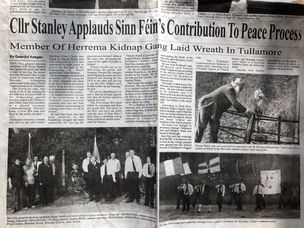 Commemoration of Matthew Kane’s death came quickly in February 1922 – a month before the British vacated the town’s barracks so close to Kane’s house and six months after the Truce. The Offaly Independent was burnt out by the British forces in November 1920, but the Midland Tribune was on hand to report on the walk to Mucklagh of Kane’s old comrades. All the ex-prisoners and ex-internees were present and walked in procession headed by the pipe band. Fr Smyth of Rahan, a strong Sinn Féin supporter, who had been interned led the prayers.