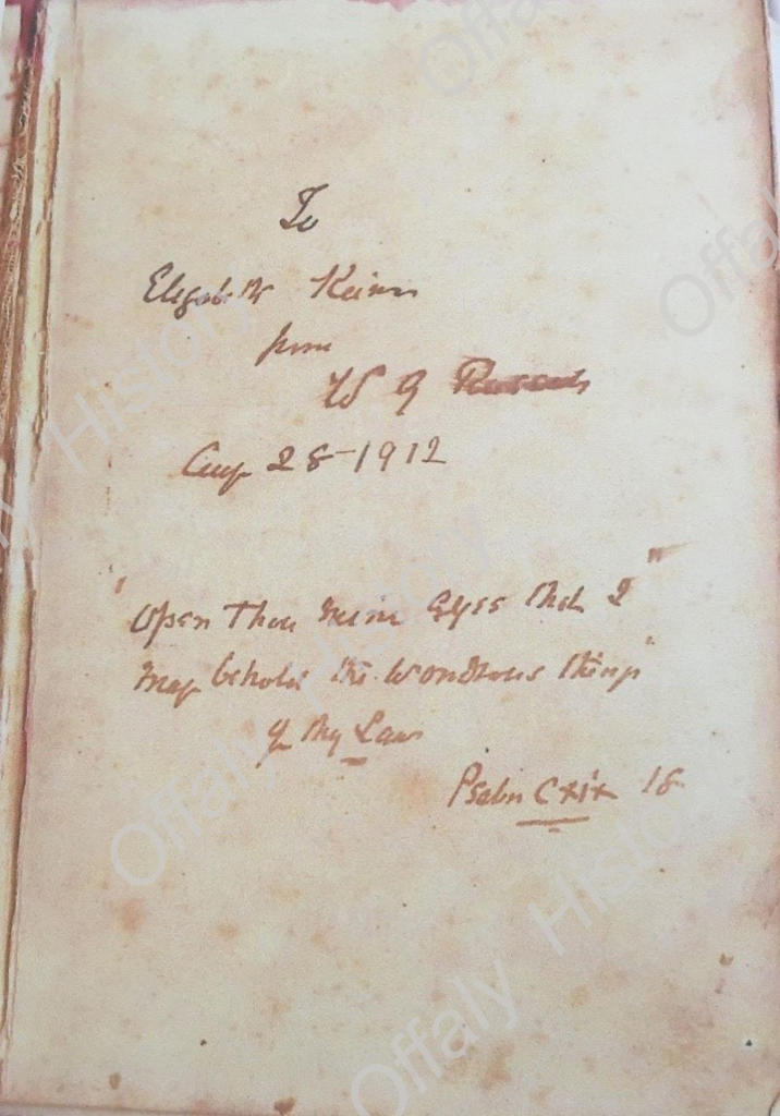 The incumbent at Geashill at the time of my grandmother’s marriage was Canon W. G Russell. He gave her a bible to commemorate the marriage. It was within its pages she recorded family events like the births of her children and where she kept newspaper cuttings of local events and notices pertaining to Geashill. Interestingly, there were no records relating to her siblings and parents. Maybe their memories were two painful to record or stigma attached to tuberculosis made her fearful of recording these events.