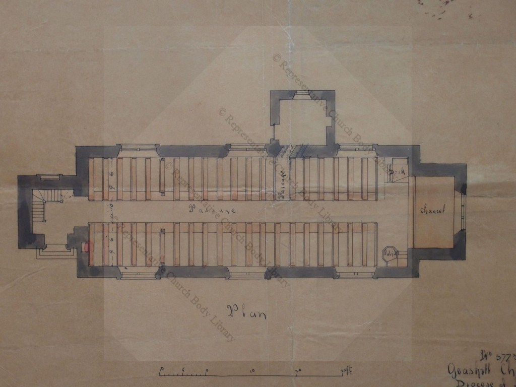 Plan of renovations to the church, 1868. Welland & Gillespie, “Geashill Church. Diocese of Kildare. No 5773. Plan. Welland & Gillespie. Articles of Agreement 22 August 1868,” RCB Library – Architectural