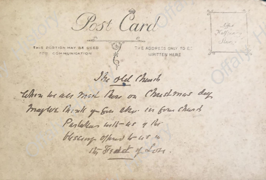 The image of Geashill parish church from the postcard, circa 1900, covered in ivy.
