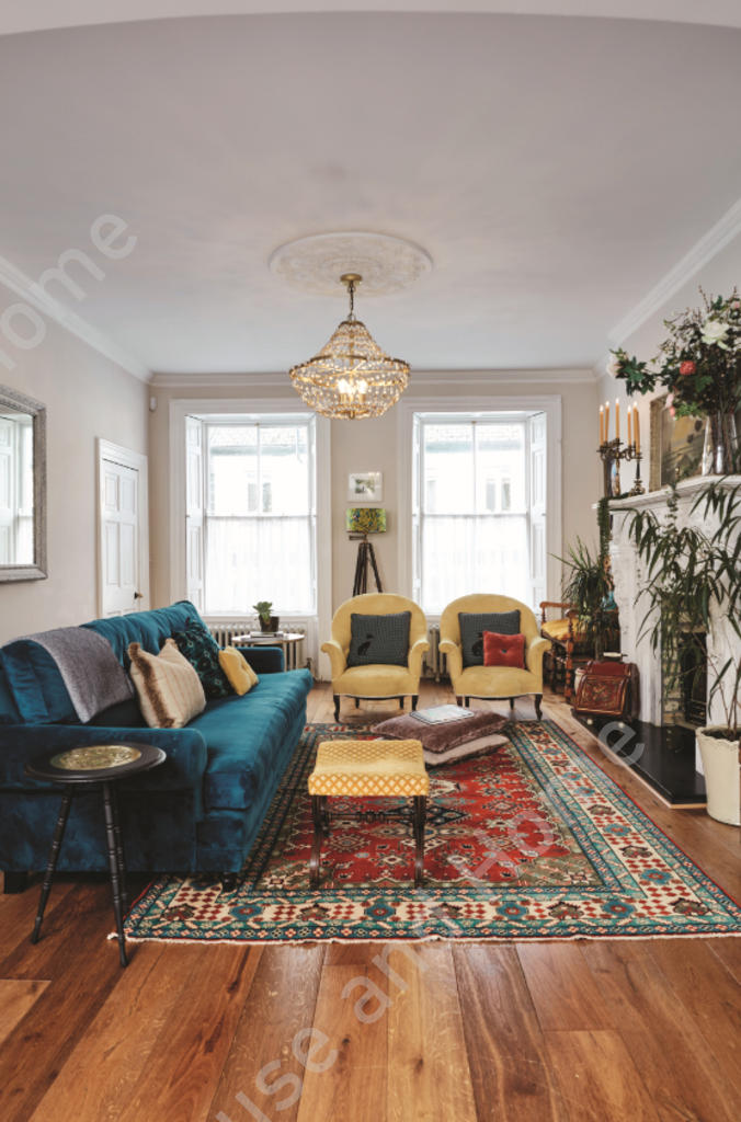 The yellow armchairs are from a fair in France and the sofa was made bespoke. The rug and ecclesiastical side table with the gold insert are from The Store Yard in Portlaoise. Extra cosiness is added to this room with cushions from Grove Home and Anthropologie. “The lamp in between the two windows is a converted antique tripod and the shade I covered with Emma Shipley fabric. I love her stuff, it’s very psychedelic”, Tanya adds.