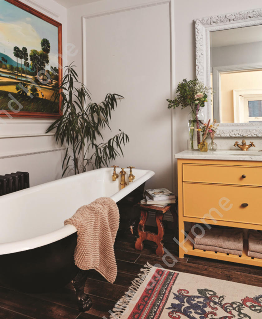 The paint colours in the main bathroom are all from Farrow and Ball. The walls are ‘Blackend’, and the bespoke vanity by Dermot Bracken is ‘India Yellow’.