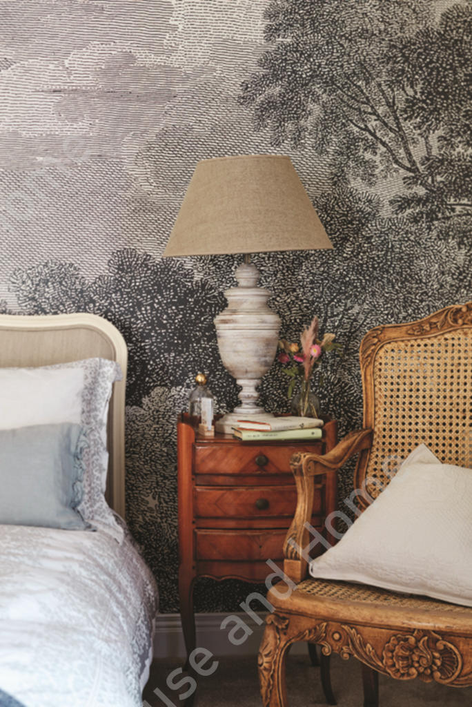 The mural in the master bedroom is from Anthropolgie, and it’s offset by ‘Dimity’ from Farrow and Ball. The linen bed is from Laura Ashley, and is anchored by two antique lockers from France.