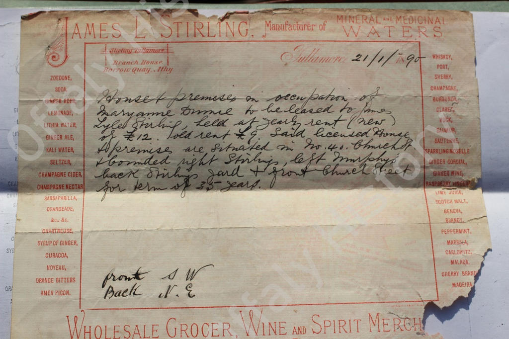 Stirling was the Tullamore shipping agent for transporting people and goods to America, Australia, Canada, and other parts of the world, a business that his father before him had set up. This most likely facilitated him to set himself up as a direct importer of a large variety of beverages that he sold in his establishments including brandy, port, sherry, wines, clarets, whiskeys, rum as well as Chinese and Indian tea. He also sold a wide variety of minerals waters, Guinness stout and Allsopp’s ales and later John Jameson & Sons whiskey, Kirker & Greer The Shamrock Whiskey. He bought his products in bulk and bottled them in his factor off Church street, Tullamore. Amongst his many businesses he became the agent for Sun Fire and Life Office, a life insurance company.