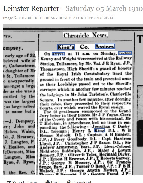 According to newspaper reports, the judges would arrive at Tullamore train station to be received by the High Sherriff and a guard of honour from the RIC. The judges would then have been taken in the Sherriff’s carriage to John Tarleton’s house in Charleville Square, which is now the site of the present day library in O’Connor Square, where they donned their judicial robes and proceeded to the courthouse in great style and ceremony which we can see demonstrated here in the photograph of their arrival in the grounds of Tullamore Courthouse preceded by mounted RIC police. By 1919 however, with the War of Independence in full swing, the mounted RIC were replaced by the Army for the judge’s safety.