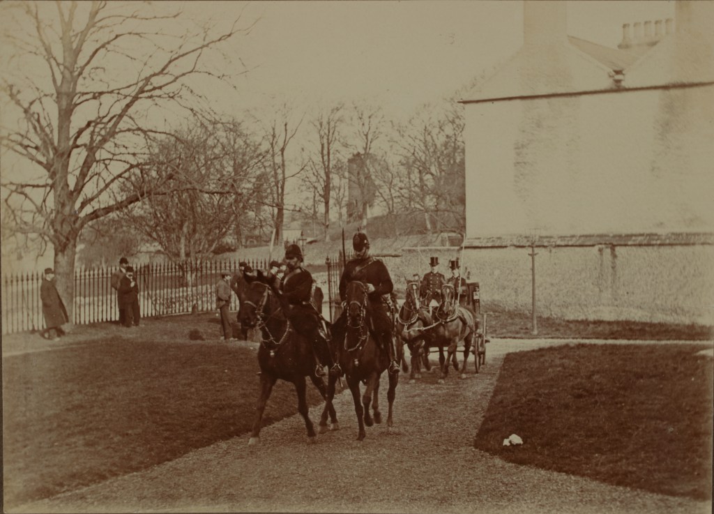 While the local government functions of the grand jury ceased in 1899 when the county councils were formed, the assizes courts continued until 1921. There was always great pomp and ceremony accompanying the arrival of the King’s judges to the assizes and we have a great photograph in the archives which was taken at some point in the last decade, probably the 1910s, of the arrival of the judges to the grand jury assizes at Tullamore Courthouse.