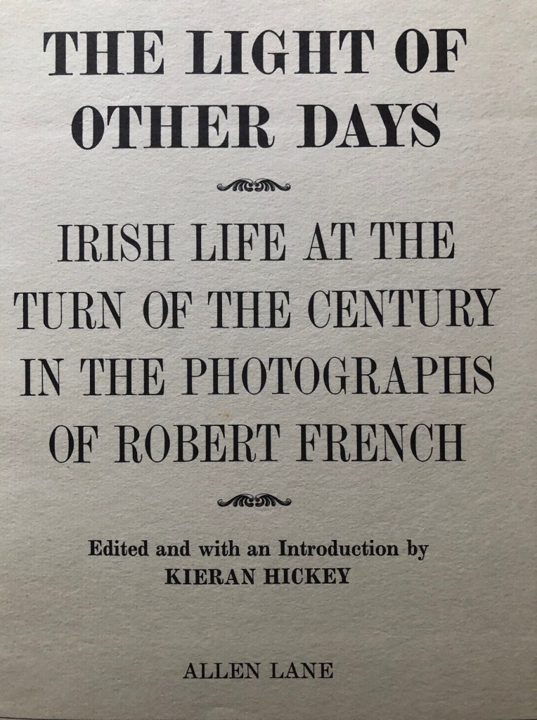 It was the work of filmmaker Kieran Hickey (1936–93) in his book, The Light of other Days (1973) and his film of that name, and also Faithful Departed,who first shone light on the collection and its main author, Robert French. French was an ex-policeman, who as an employee of Lawrence, had the enjoyable task from about 1870 until 1914 of going about the country taking pictures many of which were sold as postcards or in small albums by agents such as Morrison in Birr. Most of the Offaly pictures date from about 1912-14, but there a few of early vintage in both Birr and Tullamore.