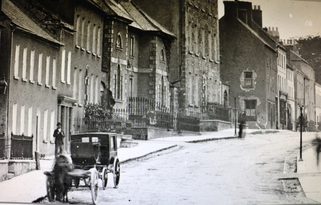 The photograph of O’Connor Square and High Street is the earliest in the Lawrence Collection for Tullamore and may be about 1900, or a few years earlier. It is the best view surviving of the Joseph Flanagan house of 1787 from what was Rafter’s Drapery after 1900 for about 30 years. There are no telegraph poles. On the left can be seen the lamp and the gas lamp of Col Crowe’s house of 1750, later Brown’s hotel from the 1870s (later again Colton’s/Sambadino’s). Next, beside the man with the pipe, was the former McMullen house demolished in 1946 for the new Ritz Cinema (demolished 1980). Most interesting is the fine shop front with Doric columns (now Eye Contact) and before Kilroy’s old house. Here the railings have survived unlike Colton’s – removed in 1974). The magnificent Crawford house is followed by Dr Wilson’s (1789,) now Donal and Ann Farrelly. Ray Allan’s can be seen with the newly broken out windows, and the old front to Spollen’s pub. The old house of Dr Moorhead’s (white, now Direct Provision hostel) closes off the view on the left side of High Street. The streets have the stone channels part of which could be seen in O’Connor Square up to the 1970s at least.