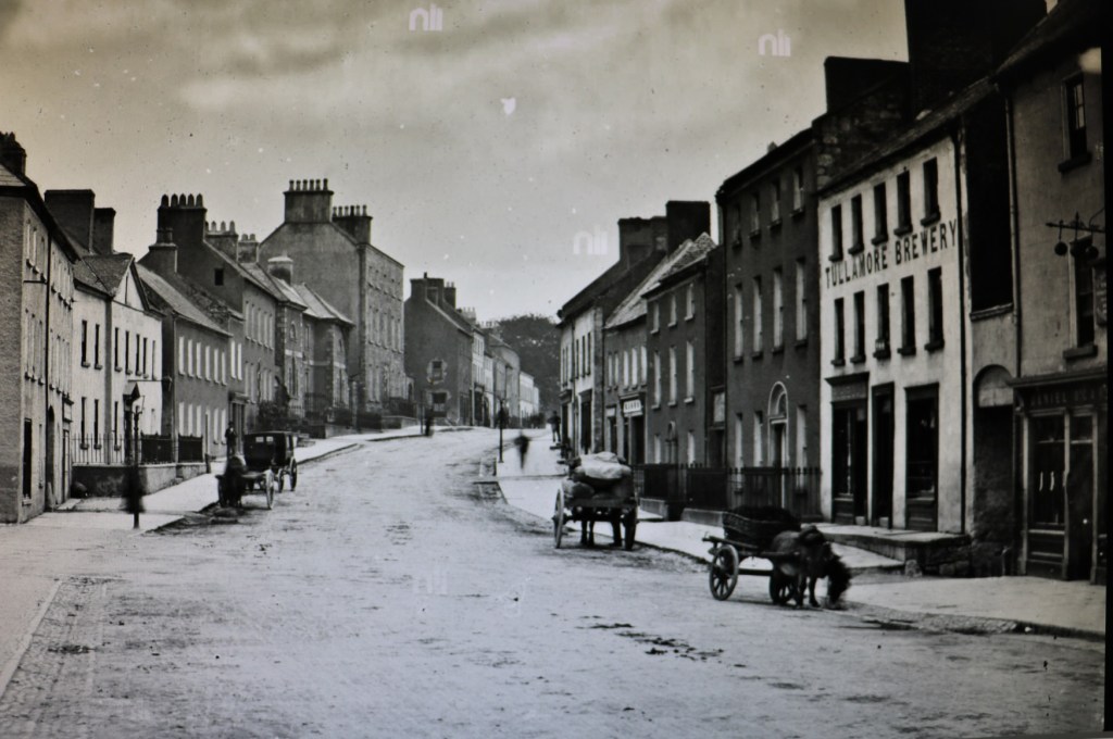 The Lawrence Collection of some 40,000 photographs are well known. Perhaps less so that the online catalogue from the National Library (nli.ie) is in large format, high resolution, for the Offaly towns, allowing us to dig down/zoom in to see the detail that escapes one looking at the ubiquitous printed photograph in the pub or the tablemat. There are almost 200 Lawrence photographs for the Offaly towns and villages. For Tullamore there are at least 17, for Birr over 70, Banagher 3, Clara 20, Edenderry over 16, Portarlington 18, Kilcormac 12 including four placed in County Cavan, Clonmacnoise at least 33, Kinnitty 3, Mountbolus 1, and perhaps more to be identified. These figures are estimates and likely to change such as one of the earliest for Tullamore (late 1890s perhaps) that became available in recent years, or at least better known and the subject of this blog.