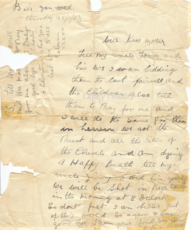 Fig 2. The harrowing letter from Columb Kelly to his mother Rose Kelly before being executed at Birr Castle on the 26 January 1923. Courtesy Rosaleen Monaghan.