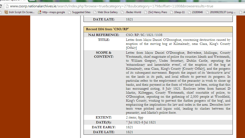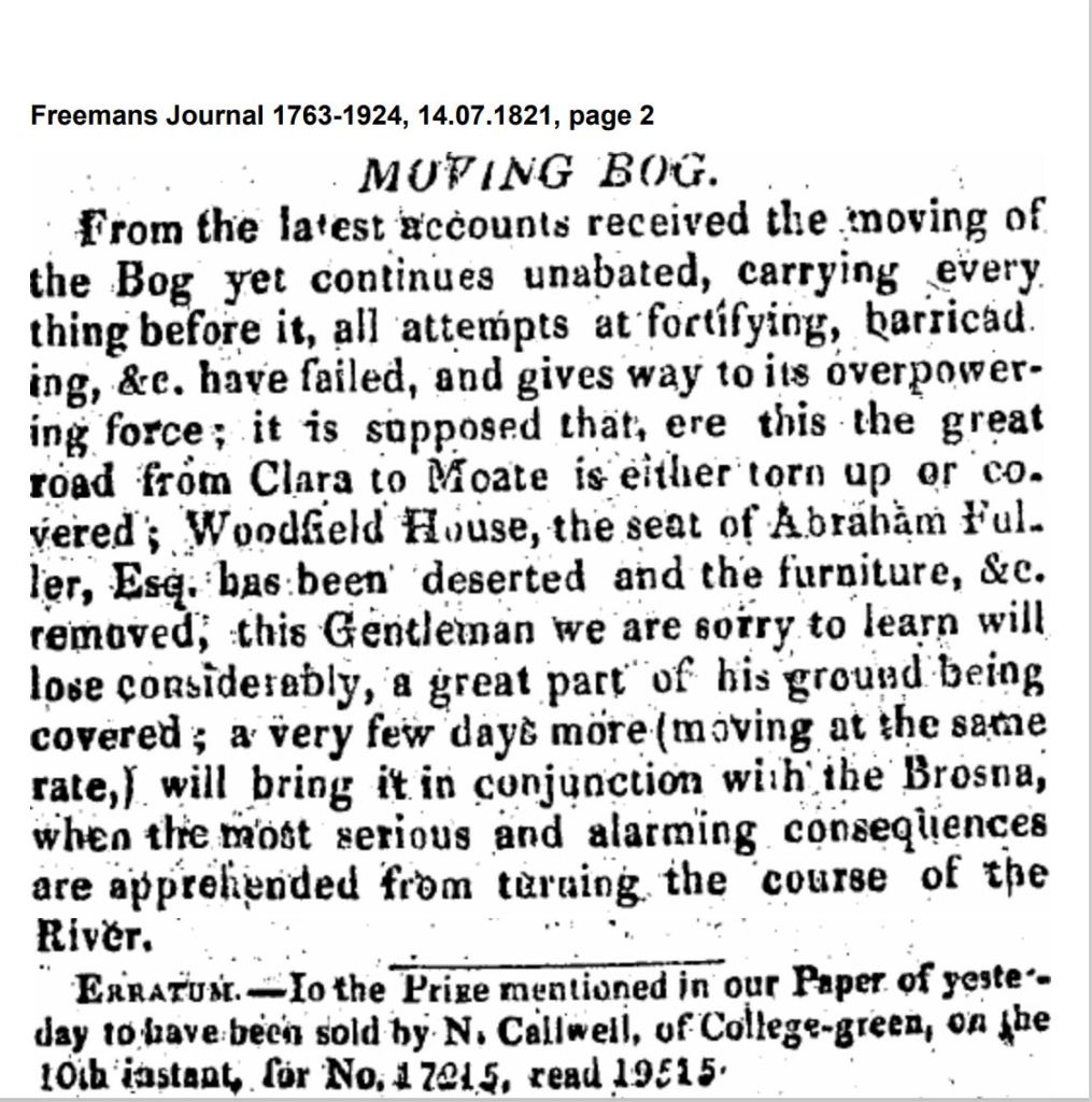 A report from Faulkners Dublin Journal for 7th July 1821 stated that the ‘The moving bog near Clara is proceeding down the low lands with an amazing front of about 200 feet wide and 80 feet deep. It moves at the rate of about 2 yards an hour and keeps this space steadily’ These comments were part of a letter from Samuel Robinson, a Quaker, dated 3rd of 7th month, i.e. 3 July.
