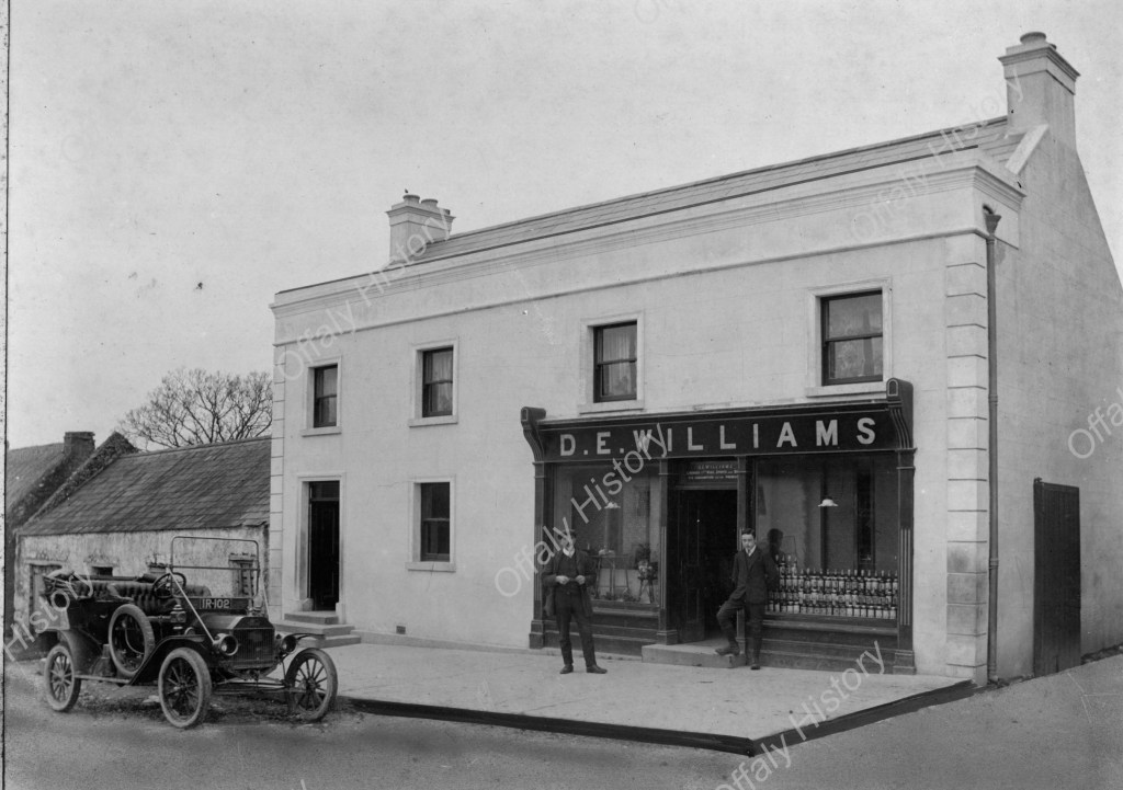 What is clear is that the new stores made for a revolution in retailing as is clear from the surviving photographs. The first motor car in the King’s County was purchased by D.E. Williams in July 1898 to transport goods from Tullamore to Birr and other midland towns. The shops all had similar timbered fronts in black with the name Daniel E. Williams painted in gilt.