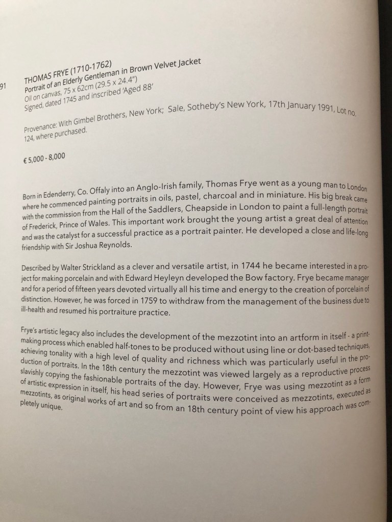 Was the question answered in the title to his book? Not really. We only wish he was still with us. Homan Potterton was born in 1946 and died, aged 74, in 2020. Potterton has given his art collection to be auctioned for charitable purposes and the sumptuous catalogue includes works by Offaly connected painters of the eighteenth-century, Charles Jervas and Thomas Frye. He also had some nice water colours by the Tullamore born Jeremy Williams (. 2016) – himself the subject of a memoir in recent times. The earlier painters are the subject of entries by Offaly-connected Nicola Figgis in the co-authored Paintings in the National Gallery of Ireland (vol i) and in the DIB (now free online). This short note is by way of saying that Homan Potteron will not be forgotten and that his contribution to the history of art and to family history will endure.