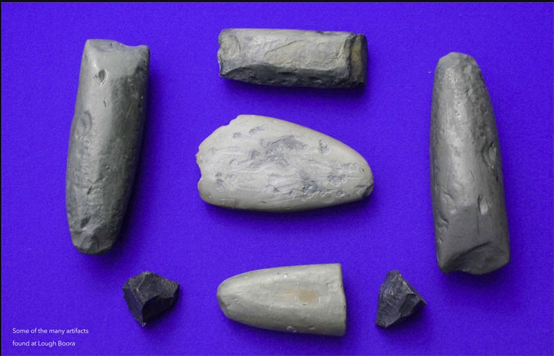 in 1977 an early Mesolithic habitation site was discovered on the shoreline of a post-glacial lake in Co. Offaly. The Lough Boora Mesolithic site was discovered during peat extraction after the lake had been drained.  Initial finds of stone tools triggered a full excavation of the site in 1997.  The site had been protected by a thick layer of peat that had grown well after the Hunter Gatherers had left. A total area of 2,000 m² was excavated.  A large amount of burnt mammal, bird and fish bones were recovered with about 200 microlithic stone tools.  No signs of structures survive at Lough Boora, unlike Mount Sandal.