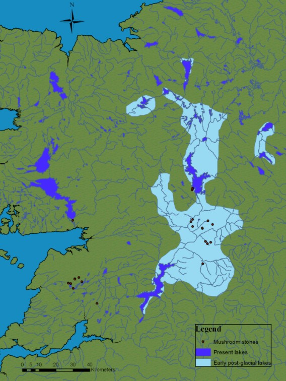 There is much evidence on how flooded the central Midlands were after the ice age. One of the more interesting deposits left behind were mushroom stones. The mushroom stone at Crancreagh, Co Offaly shows signs that the lake level reduced over two significant periods. Carving the stone into its unique mushroom shape was the result of waves lapping against it over two distinct periods.