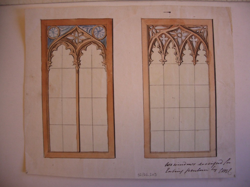 Having seen that, it was time to look more closely at the collection of Charleville drawings which had been auctioned in the 1980s. Many of these are in the Irish architectural Archive, and those that were not bought were photographed. Here I found two pages of designs for windows that were signed by Catherine (‘CMC’: Catherine Maria Charleville). There is a sketch of a door annotated in her hand writing. There is a drawing showing a section through the castle depicting the wall decoration and furniture that had been attributed to Catherine. Rolf Loeber had a perspective drawing of the castle which showed the building, not quite as it was built, in a clearing in a wood. The architecture was quite confidently drawn and the trees were excellent. It was labelled ‘Countess Charleville’. I looked again at some of the sketches of early ideas for the castle in the Irish Architectural Archive. In one, the building design was hesitant while the trees were detailed; an architect wouldn’t bother with such good trees for an early design sketch. There was another that had an architect’s stamp; the massing of the building quickly drawn, the surrounding trees extremely shadowy. I could see Catherine and Johnston talking about the design in these drawings.