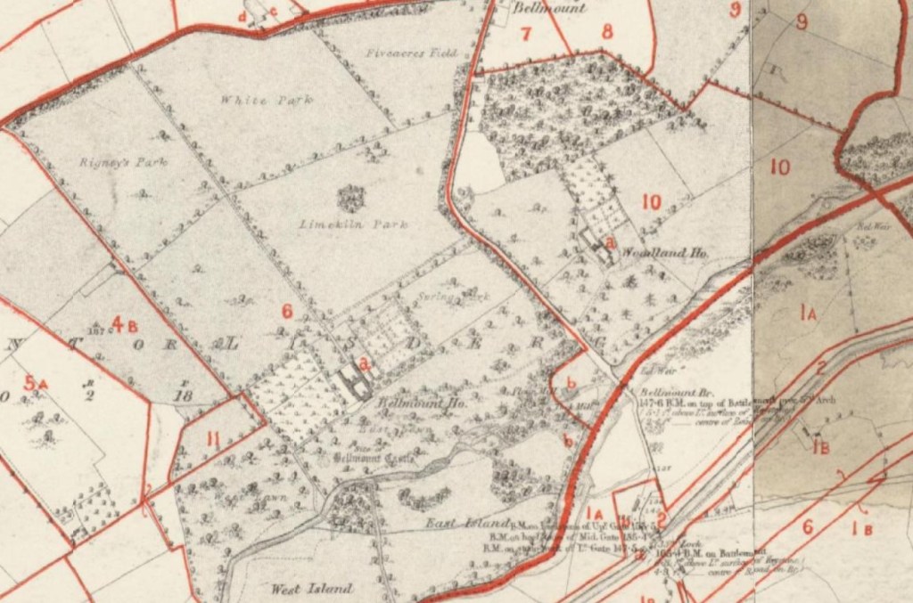 Griffith’s maps sometimes reveal a little extra such as this one showing fieldnames in the townland of Belmount or Lisderg: Rigney’s Park, White Park, Limekiln Park, Fiveacres Field, and Spring Park.[10]