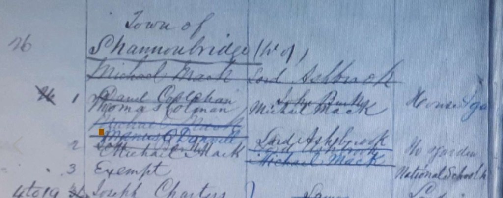 Cancelled Books allow us to pinpoint three of the houses in which schoolmaster Manus O’Donnell lived in Shannonbridge from the 1860s to the 1920s.[11] For example, in the 1860s he lived in House #2, on the Raghra side of the village: