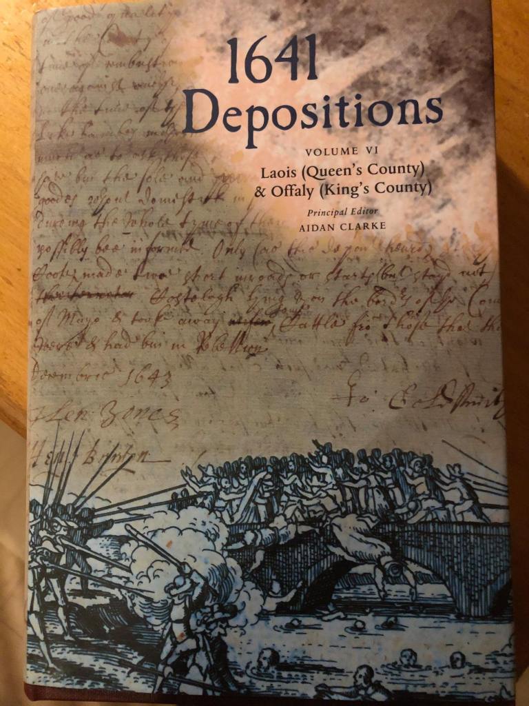 The 1641 Depositions, Laois and Offaly (vol. 6 in the IMC series). Aidan Clarke, principal editor, 580 pp, hardback, €50. Inc. postage in ROI €53.95. Available from www.offalyhistory.com, pay by credit card or PayPal. https://www.offalyhistory.com/shop/books/1641-depositions-volume-vi-laois-queens-county-and-offaly-kings-county