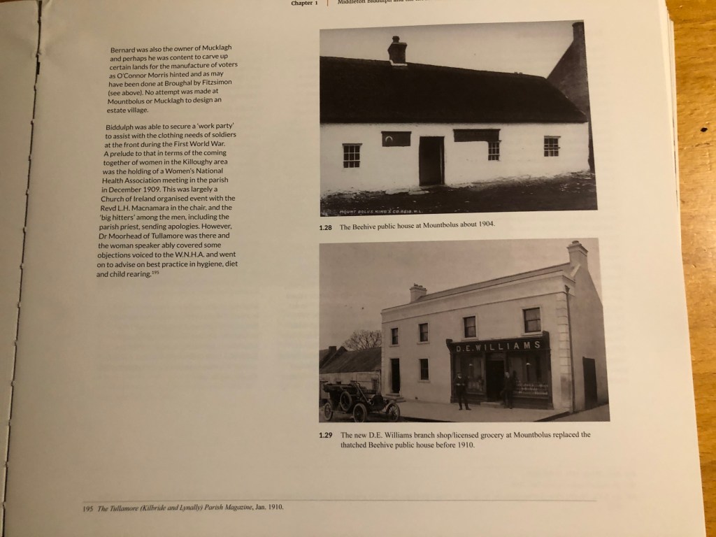 Biddulph had explored the history of the area and he knew of the great O Molloys and the losses they had suffered in two waves of confiscation. Biddulph was a decent landlord and employer and was well thought of by his neighbours. In the wider circle of his own friends, and in the context of the performance of his civic duties, he was well regarded. He did not succeed in being elected to the first county council in 1899 but was co-opted to a number of local boards and held a seat up to 1920–21. He was, of course, a member of the King’s County Grand Jury and served as High Sheriff in 1901 and was a deputy lieutenant of the county.
