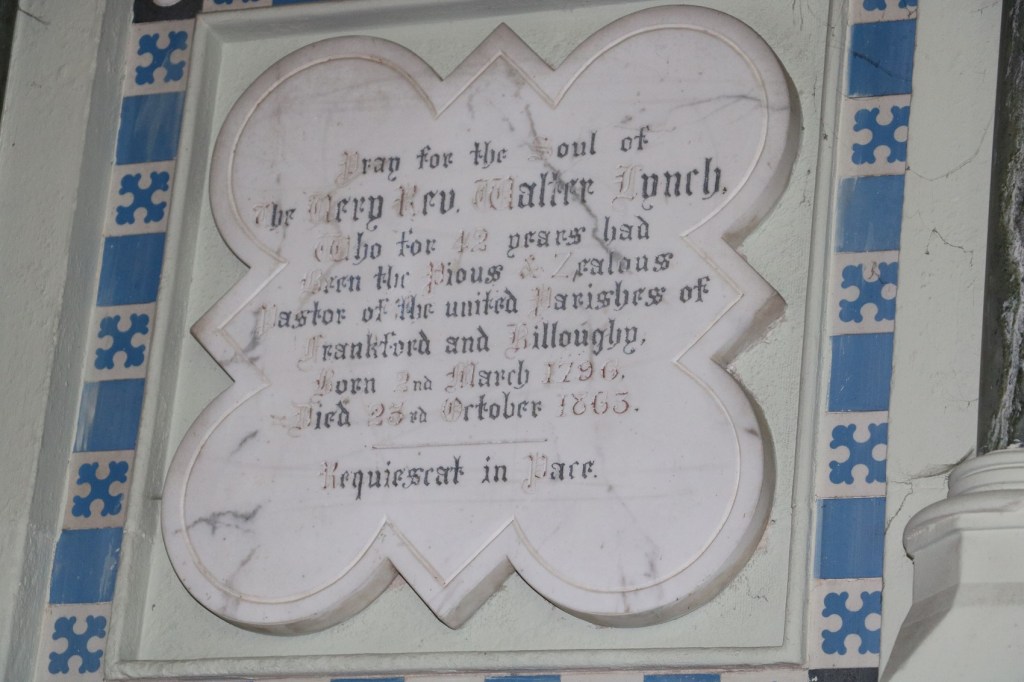 The Catholic church was erected in the village and dates from 1837. Unlike in many towns including Kilcormac it had a central location and was not shunted to a back street. It is a large barn style pre-Famine church and was designed to cater for a population three-times greater than that in 1911. The fine monument in the church is to Revd Walter Lynch who was the parish priest from the early 1820s until his death in 1863. He was a great reforming clergyman but alas no archive of his survives except in the carefully-kept parish registers recording his 1826 census, the loss and death of local people during the Famine years, and the shocking fall in the marriage rate in the post-Famine period. The memorials in the adjoining cemetery record the great and good such as the Barretts, Scullys, Molloys and Commins families. The population in the village in 1826 was 179. In 1831 it was 164 and with 30 houses. In 1841 it was 1841 with forty houses. By 1901 the population of the village had fallen by half and was 96. The area of the village was put at twelve acres.