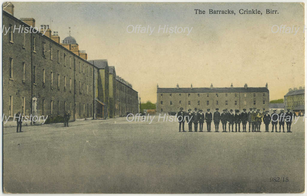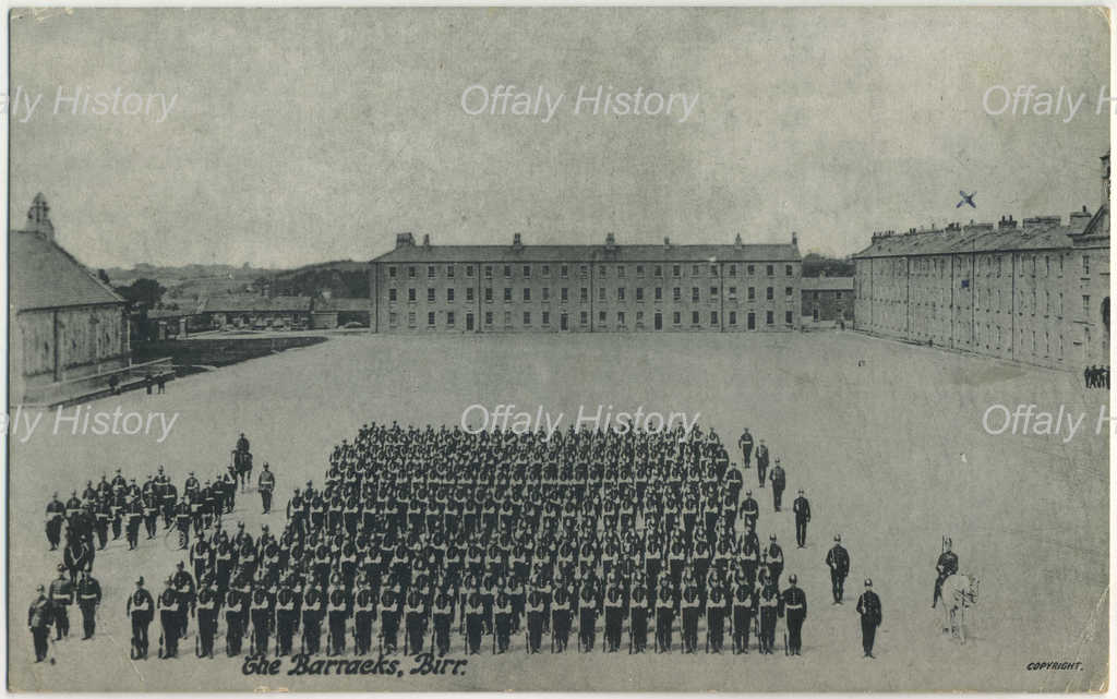 With the handing over of Birr Barracks ended 110 years of occupation by various regiments of the British Army. Originally constructed between 1809-1812 as a response to the threat of French invasion and or internal insurrection. In 1881 the barracks had become the depot of the then newly formed Leinster Regiment, with a fixed recruiting area of Meath, Westmeath, Longford, Offaly and Laois. Despite the regiment’s relatively short existence, links with Birr and Offaly have endured the past century with many people having ancestral links.