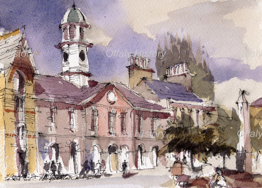 Regrettably, my home town lacks the physical drama of Kilkenny and Lismore dominated by fortresses standing on cliffs, the waterside charms of Kinsale and Carrick on Shannon, the mystery of the mediaeval alleyways of Galway and Carlingford or the suave urban quality of Westport, Clonakilty and Birr. Nevertheless, it’s qualities, modest as they are, have always inspired me and I have often tried to capture them in drawings. Tullamore’s few architectural setpieces were my first introduction to the notion that a town or a village could be a beautiful artefact as much as a painting or a piece of sculpture.