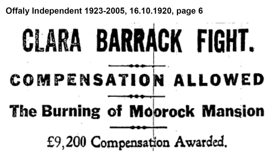 Mr Moylette applied for £16,000 compensation for malicious damage at the Tullamore Quarter Sessions. Caretaker Owen McGuinness gave evidence of having visited the house on the evening before the fire and found everything in order. A decree on the county at large was given for £9,200. Moorock House was accessed by a long avenue from the Ballycumber to Moate Road, with a Walled Garden on the right before turning left towards the Court Yard and front entrance of the House.The house has remained in ruin to date.