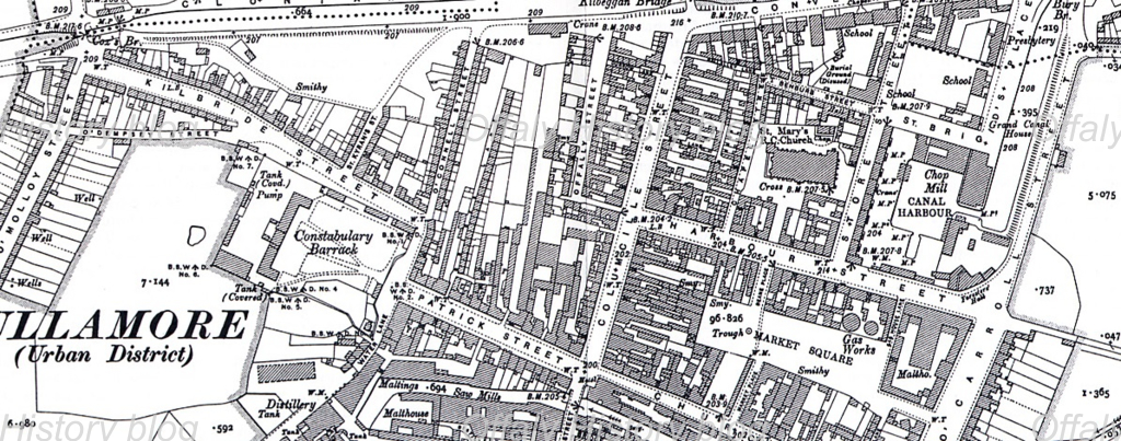 The canal engineer, John Killaly (see an earlier blog) owned the mill in the early 1800s and it is clearly depicted on his useful town map of Tullamore of 1804 (see the first blog in this series). It is also shown on the 1838 map as having a mill pond, flour mill and brewery. By early 1850 this mill had been removed as part of the deepening of the river.