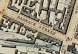 Reflecting its early development as a street beside the river, as a source of power, and with the barracks for trade and consumption Patrick Street had in the late eighteenth century the flour mill, malt houses and brewery on the southern side backing on to the river and another brewery behind what was later the Williams’ head office described on the leaseholders’ map of 1869 as the old brewery. By the 1820s this old brewery on the northern side was gone, to be replaced by a timber merchant’s yard and beside this house at nos 4 and 5 the tanning and leather business of Michael Mulready.