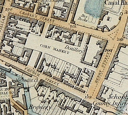 Church Lane later called Church Street is more problematic. The map of 1730 shows a chapel or church and besides we have other sources including the date stone (1726) now in Offaly History Centre, Was there a graveyard beside it? Probably yes but the only memorial surviving is that to the first earl of Charleville. This was moved to the new St Catherine’s church in 1815. From about 1820 the site of the church was used for a new shambles for Tullamore. At the same time the Market Square was developed for warehousing, fairs and markets. The gardens of Church Street, Harbour Street and Henry Street were all curtailed to facilitate the making new market place. It was a nice piece of town planning. Further down the Church Lane towards the river was a linen factory built in the 1750s. This was also removed in the laying out of the new Church Street from 1786 to the 1820s. New buildings here included the infirmary of 1788 and the second Methodist church in the same year. The Charleville Schools and St Catherine’s followed in 1811 and 1815. The site that had been intended for the new Protestant church was instead used for the new Pentland distillery in 1822. The water supply for it must have been via a drain from the river or the harbour.