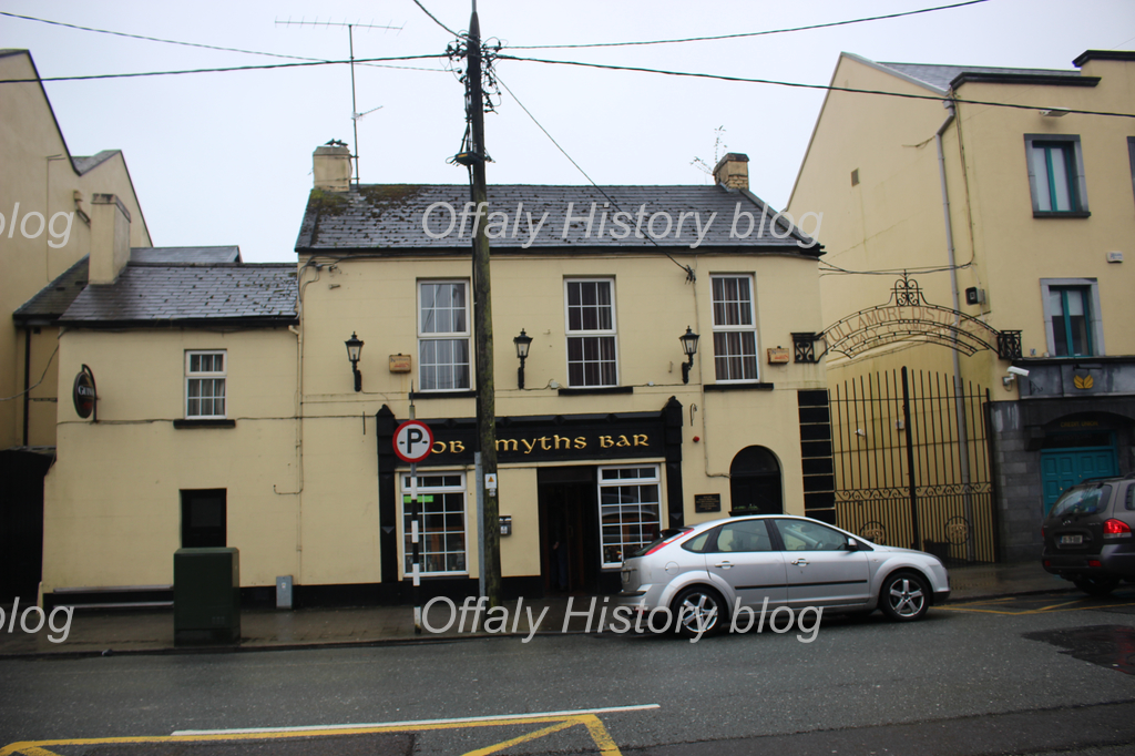 The south side of Patrick Street is also of interest with the former Elvery/Kode plot much earlier in the 1760s while the next four houses as far as Tullamore Credit Union were built by the town’s owner Charles William Bury. This was unusual as Bury would generally have leased sites to developers save in regard to public buildings and utilities. It may well be that these houses were built in compensation for some destroyed in the balloon fire. The house on the credit union site is dated to about 1802 (demolished 1980). Most of the remaining houses on the south side formed part of B. Daly’s Tullamore Distillery and were let to tenants. These back on to the river and in the 1840s before the first Brosna Drainage Scheme of the that decade were liable to flooding. The town mill was behind the Omyia pub and was possibly the original mill referred to in the grant of Tullamore to John Moore in 1622. Connected with the mill was a strip of land running behind Tullamore Credit Union on which the ruins of warehouses are located. This strip was part of the mill property and it may be that the houses from the credit union to Elvery’s/Kode replaced cabins and warehouses connected with the maltings. The cabins on this street and better houses are depicted on a surviving skeletal map of 1730 and may relate back to the cabins mentioned as constituting the town settlement in the 1620s and late 1630s.