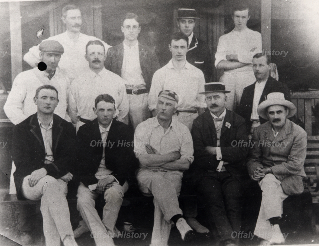Second row: Dennis Behan, Cormac Street, groundsman, Mr C. Bourchier, assistant estate agent, ——, ——– . Third row: Dr P. Kennedy, Kenneth Kennedy, professional, Gerald Egan, —– The man in the front row with the straw hat was Thomas Mitchell, Manager of the Ulster Bank in Tullamore. He had foiled an IRA robbery in May 1921 and was shot dead in a second robbery by the republican IRA in July 1922. Hundreds of people witnessed the raid but as there was no police force, there was no one to interfere with the raiders. Mr Mitchell was a native of County Tyrone and had been with the Ulster Bank in Tullamore for thirty years. Mitchell had attempted to defend himself and the Bank by obtaining a revolver at his desk and was shot in the process.