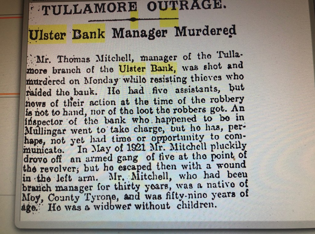 It was a quiet afternoon on Monday 3 July 1922 when Thomas Mitchell, the manager of the Ulster Bank in High Street, Tullamore was shot dead by the IRA in the course of a robbery carried out by the Republican IRA (often then called the Irregulars to distinguish them from the Free State’s National Army). Sometimes these events are called ‘daring raids but in this case and for three months previously there were no RIC policemen and the town of Tullamore was in July under the control of the Republican IRA. The Four Courts had been evacuated on 30 June and the battle for Dublin would soon be determined in favour of the Free State army. By 20 July Tullamore would be under the control of the Free State, but with pockets of Republican forces still in the countryside including in some of the bigger houses such as Rathrobin, near Mountbolus. A report of the Mitchell shooting by way of the inquest was published on 8 July by the Offaly Independent which was based in what was by then Free State territory. The issue of the Midland Tribune for 8 July is not available and both it and the Offaly Chronicle were published in Birr in the heart of Republican army territory. Both papers were censored and afraid to offend.